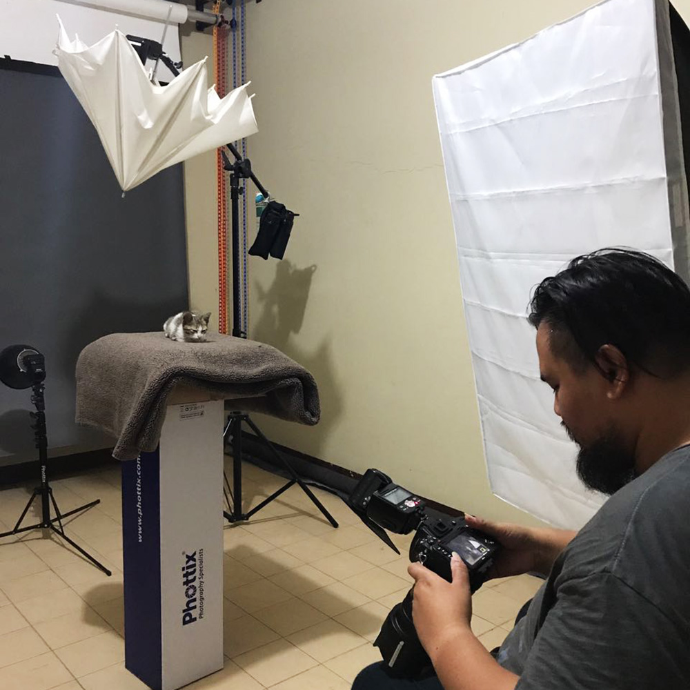 memotret kucing dengan menggunakan tiga sumber cahaya